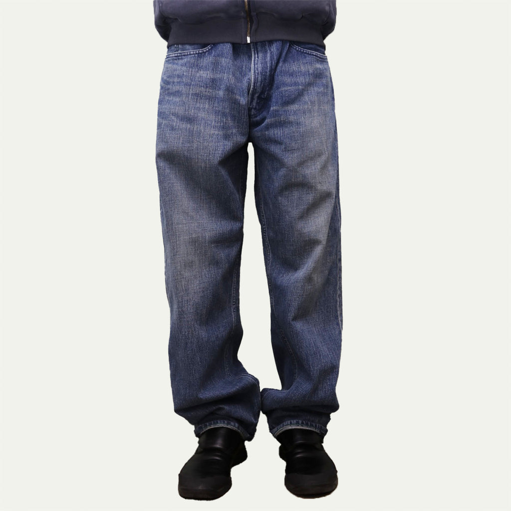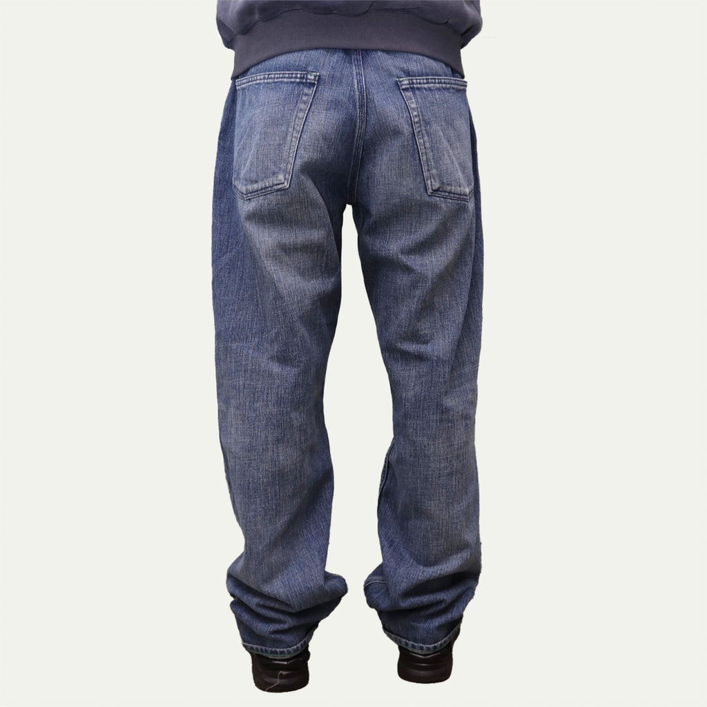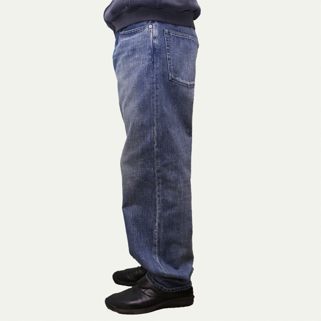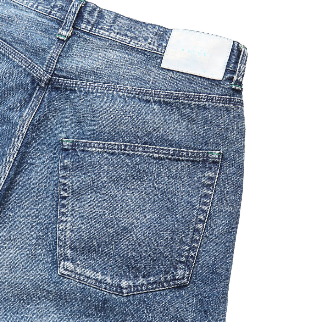 I came up with the idea of hand-stitching the hem to prevent the pants from dragging on the ground when pairing Chuck Taylor-style sneakers with baggy silhouette pants. This achieved a silhouette impossible with tapered pants. Production is by THE UNION. Their craftsmanship completes the distinguished WHIMSY denim. While featuring a loose silhouette, the hand-stitched, gathered hem—likely unique to WHIMSY—creates a one-of-a-kind silhouette impossible with tapered cuts. The hem can also be unstitched to wear the pants as a straight silhouette.
