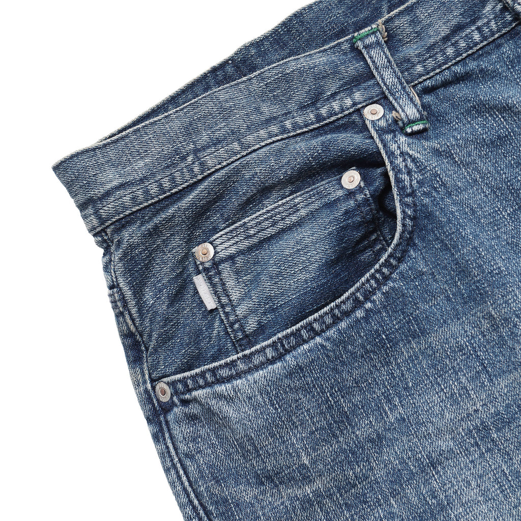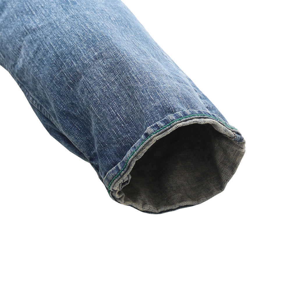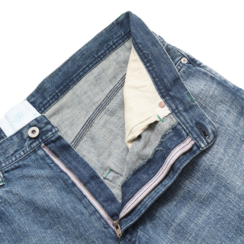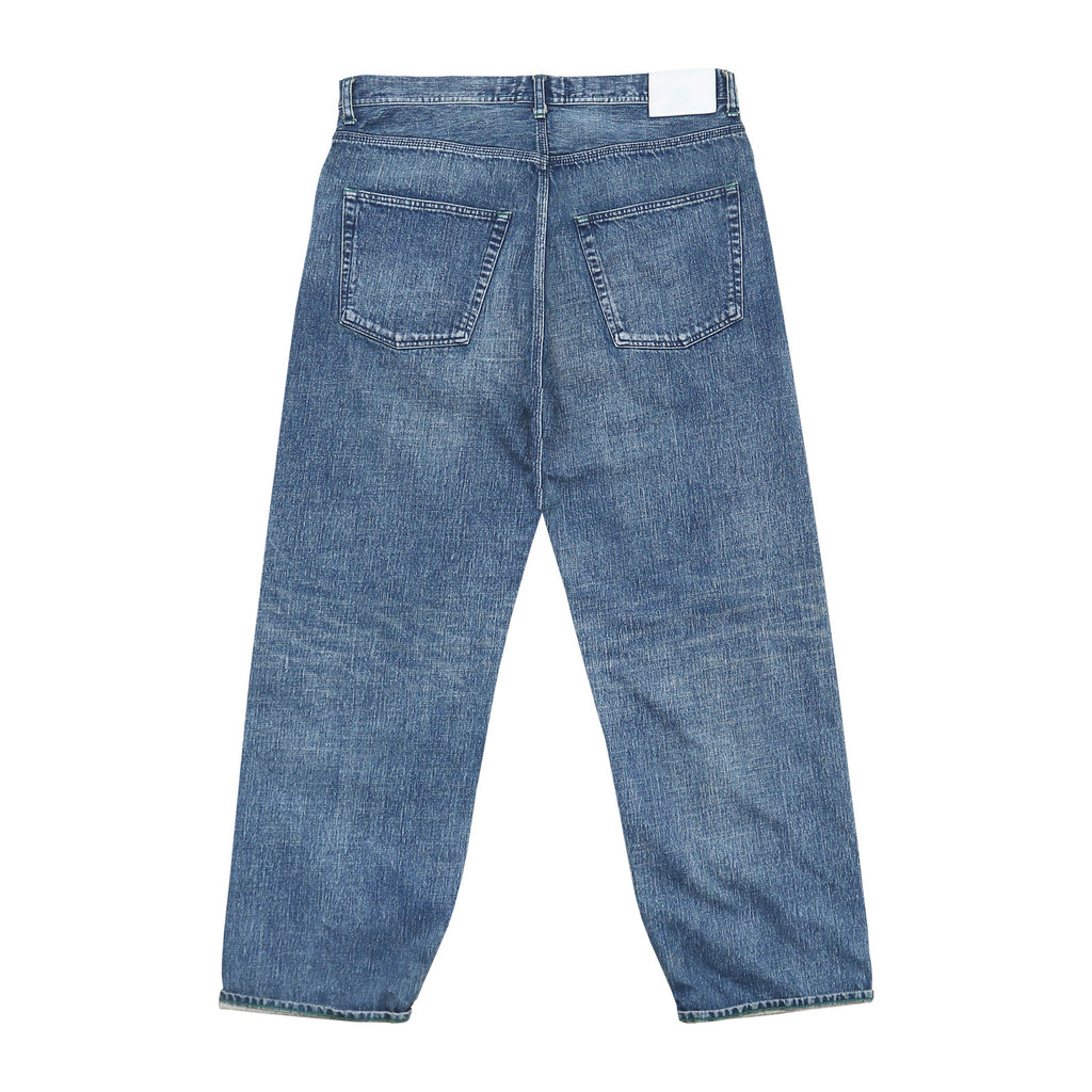 I came up with the idea of hand-stitching the hem to prevent the pants from dragging on the ground when pairing Chuck Taylor-style sneakers with baggy silhouette pants. This achieved a silhouette impossible with tapered pants. Production is by THE UNION. Their craftsmanship completes the distinguished WHIMSY denim. While featuring a loose silhouette, the hand-stitched, gathered hem—likely unique to WHIMSY—creates a one-of-a-kind silhouette impossible with tapered cuts. The hem can also be unstitched to wear the pants as a straight silhouette.