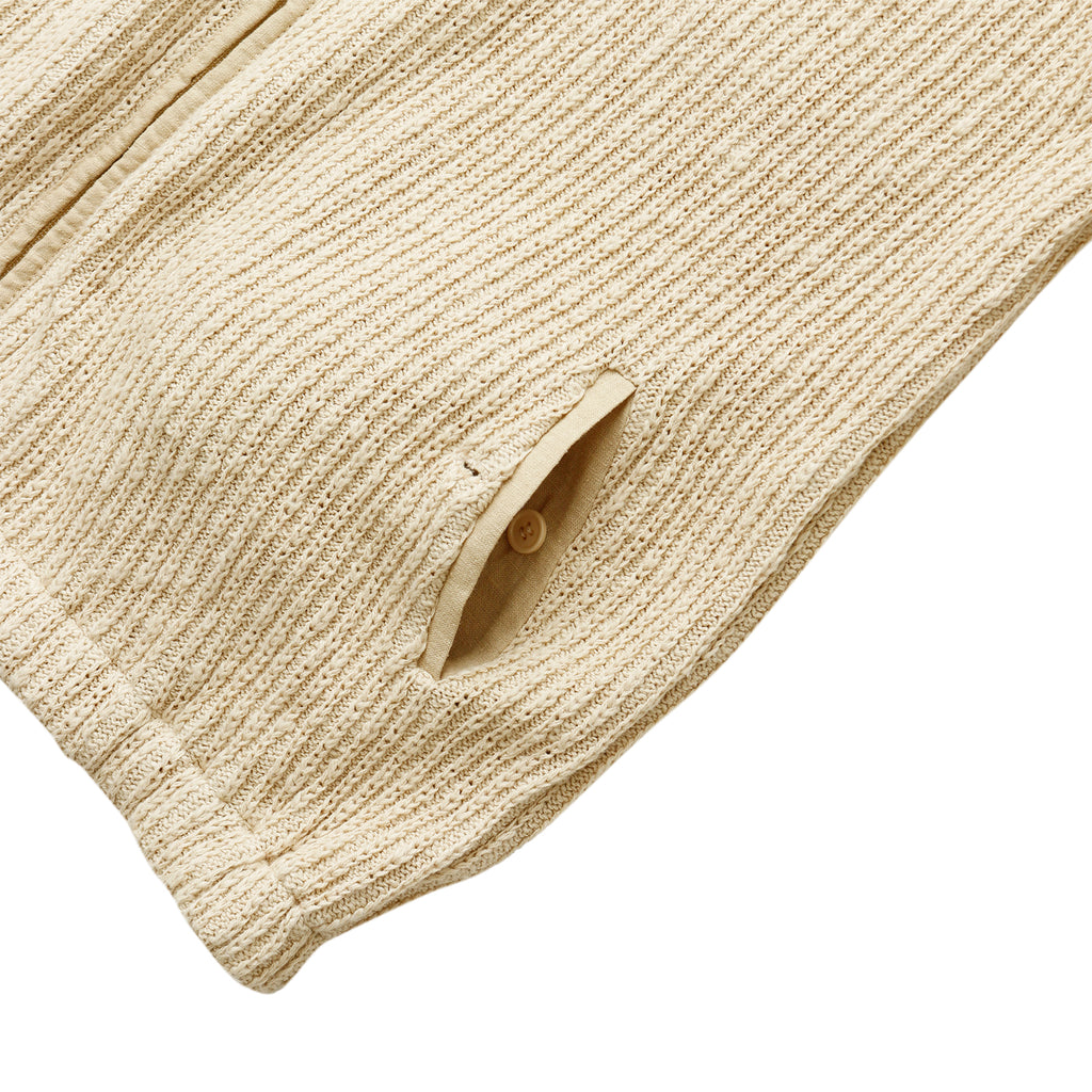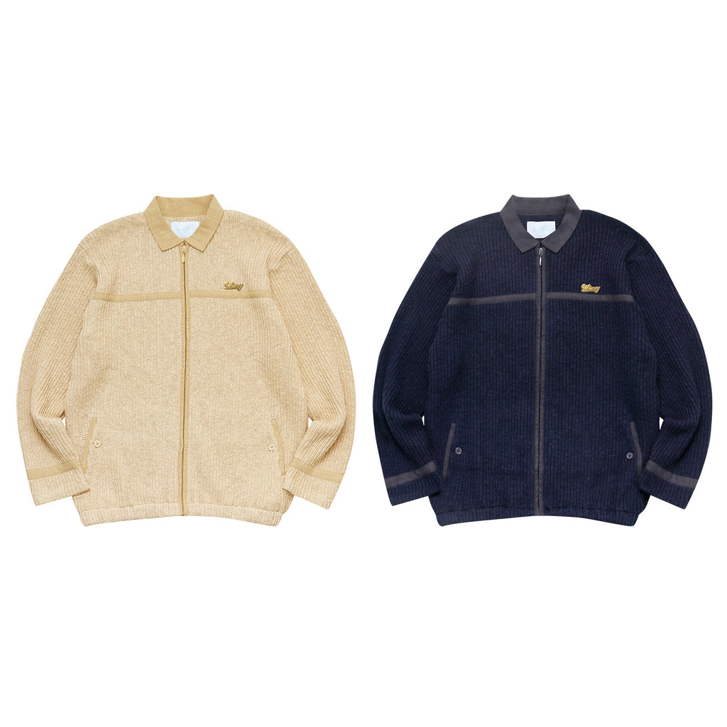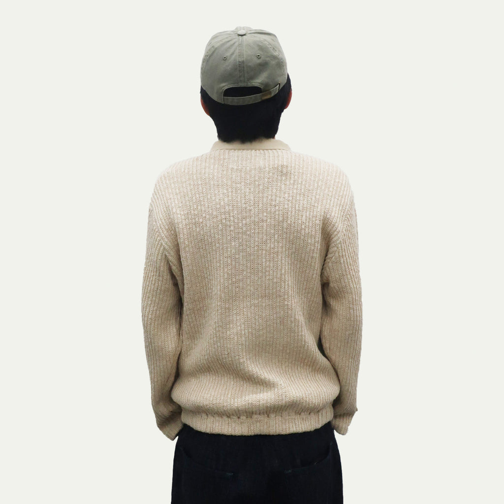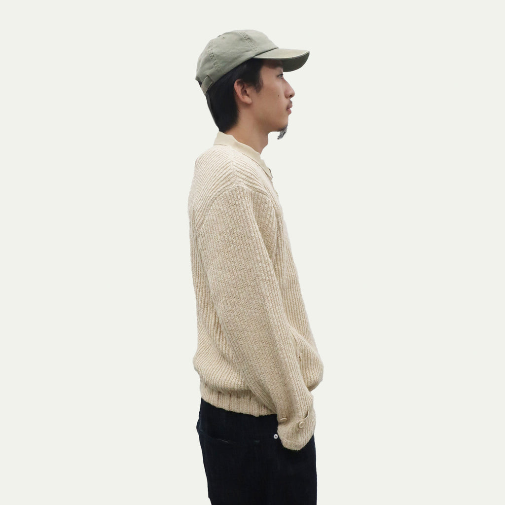 This piece features a distinctly textured knit with a rough-knit feel. It excels at creating dynamic layering effects. The relaxed width and length create an overall clean silhouette. The loosely fitted sleeves and flared cuffs with buttons are also defining features.