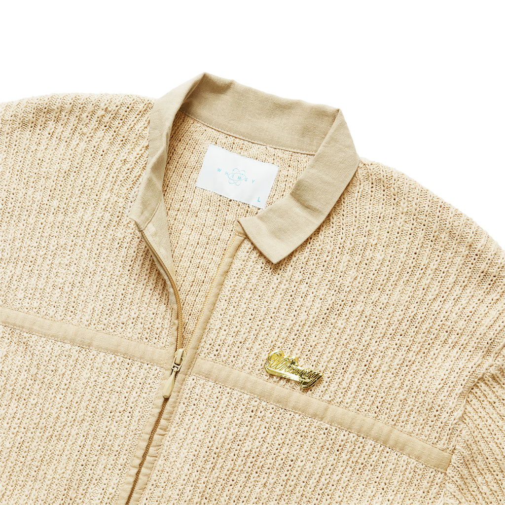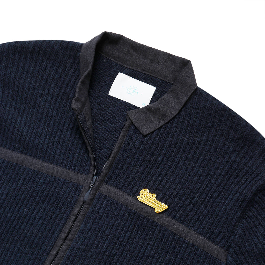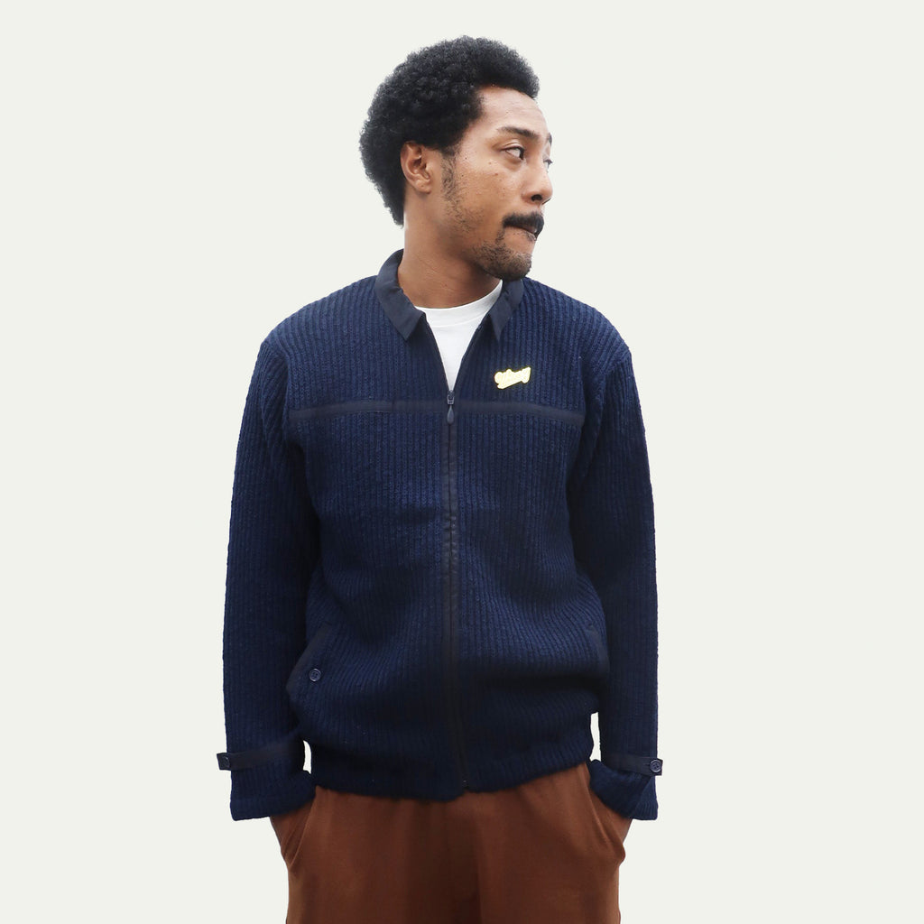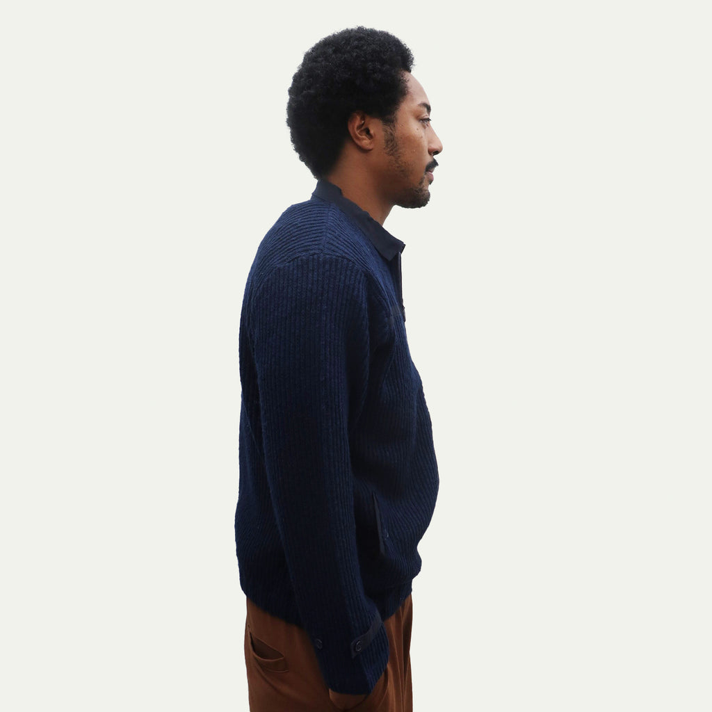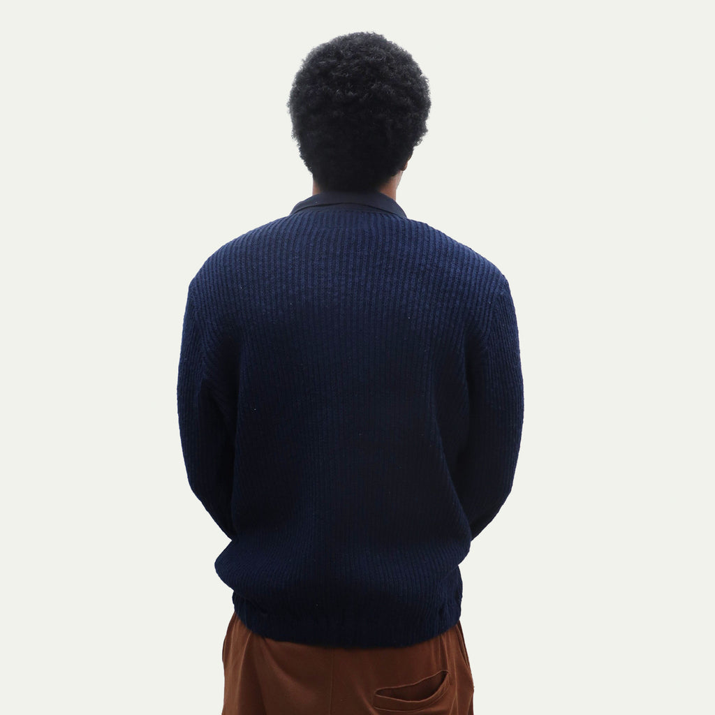 This piece features a distinctly textured knit with a rough-knit feel. It excels at creating dynamic layering effects. The relaxed width and length create an overall clean silhouette. The loosely fitted sleeves and flared cuffs with buttons are also defining features.