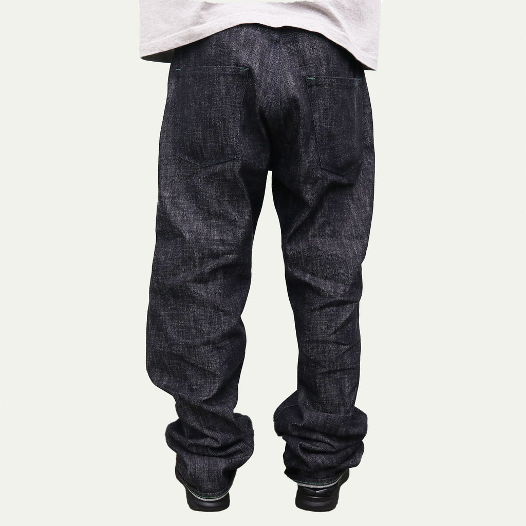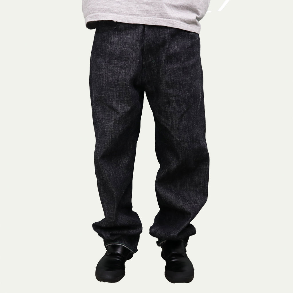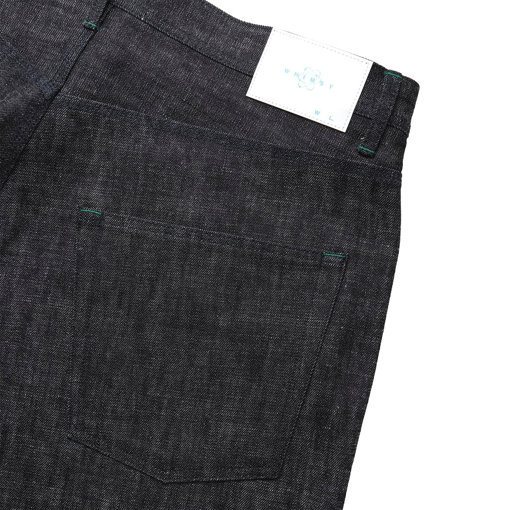 I came up with the idea of hand-stitching the hem to prevent the pants from dragging on the ground when pairing Chuck Taylor-style sneakers with baggy silhouette pants. This achieved a silhouette impossible with tapered pants. Production is by THE UNION. Their craftsmanship completes the distinguished WHIMSY denim. While featuring a loose silhouette, the hand-stitched, gathered hem—likely unique to WHIMSY—creates a one-of-a-kind silhouette impossible with tapered cuts. The hem can also be unstitched to wear the pants as a straight silhouette.