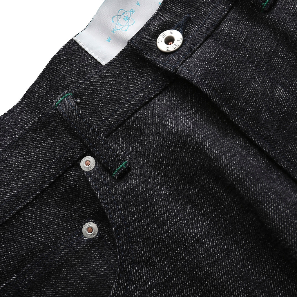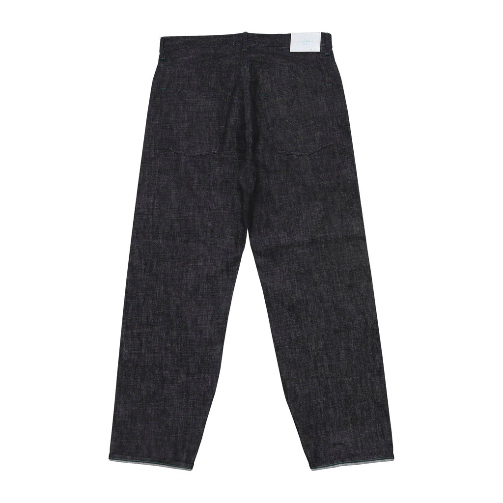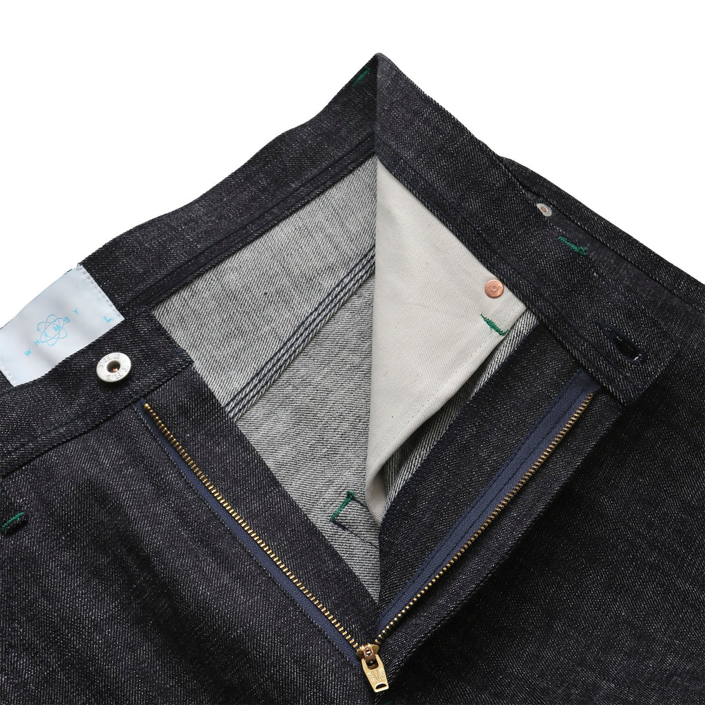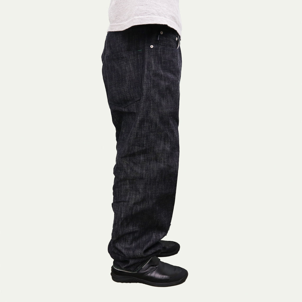 I came up with the idea of hand-stitching the hem to prevent the pants from dragging on the ground when pairing Chuck Taylor-style sneakers with baggy silhouette pants. This achieved a silhouette impossible with tapered pants. Production is by THE UNION. Their craftsmanship completes the distinguished WHIMSY denim. While featuring a loose silhouette, the hand-stitched, gathered hem—likely unique to WHIMSY—creates a one-of-a-kind silhouette impossible with tapered cuts. The hem can also be unstitched to wear the pants as a straight silhouette.