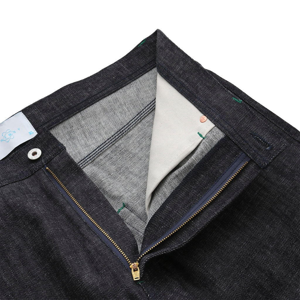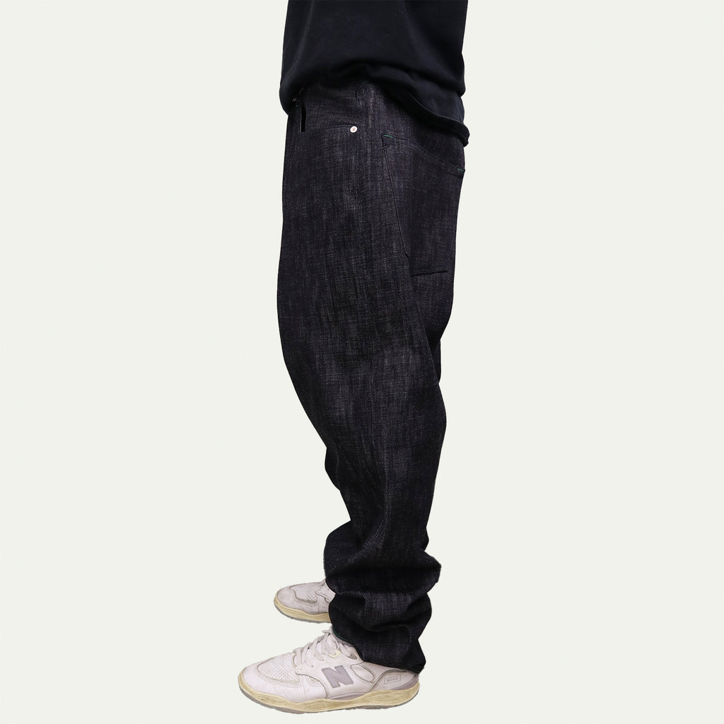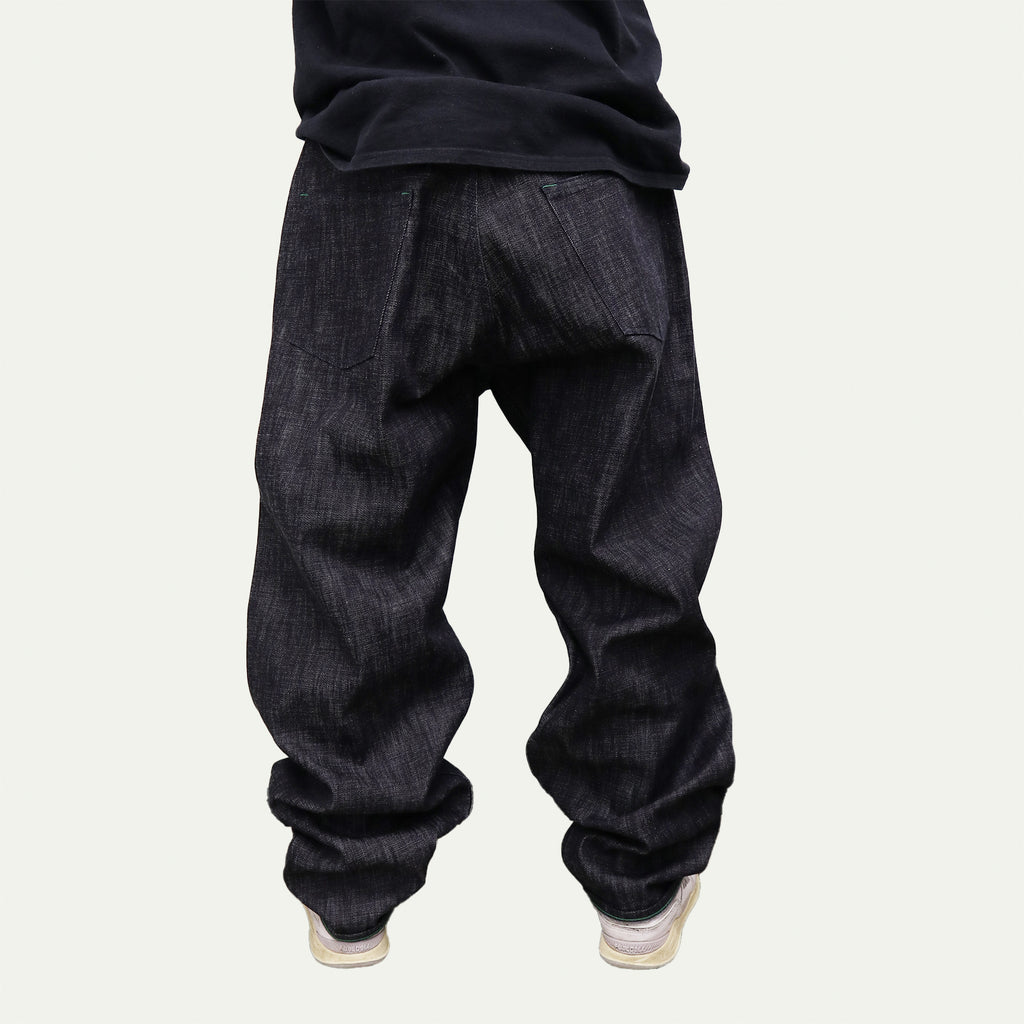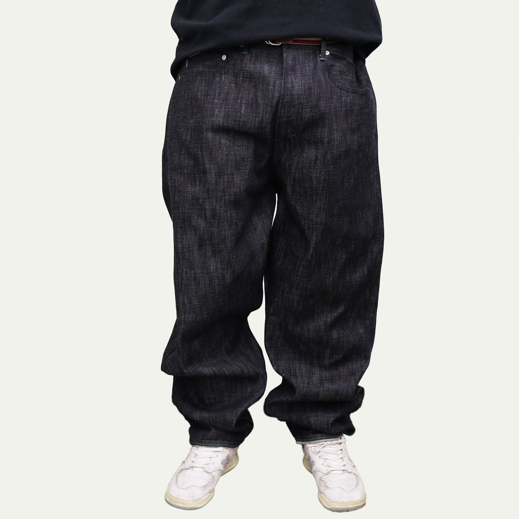 I came up with the idea of hand-stitching the hem to prevent the pants from dragging on the ground when pairing Chuck Taylor-style sneakers with baggy silhouette pants. This achieved a silhouette impossible with tapered pants. Production is by THE UNION. Their craftsmanship completes the distinguished WHIMSY denim. The silhouette further emphasizes the bagginess of the REGULAR FIT. It can also be unstitched to wear as a straight silhouette.