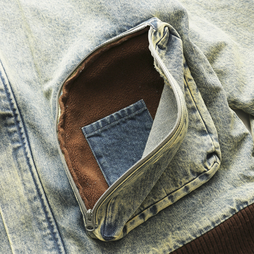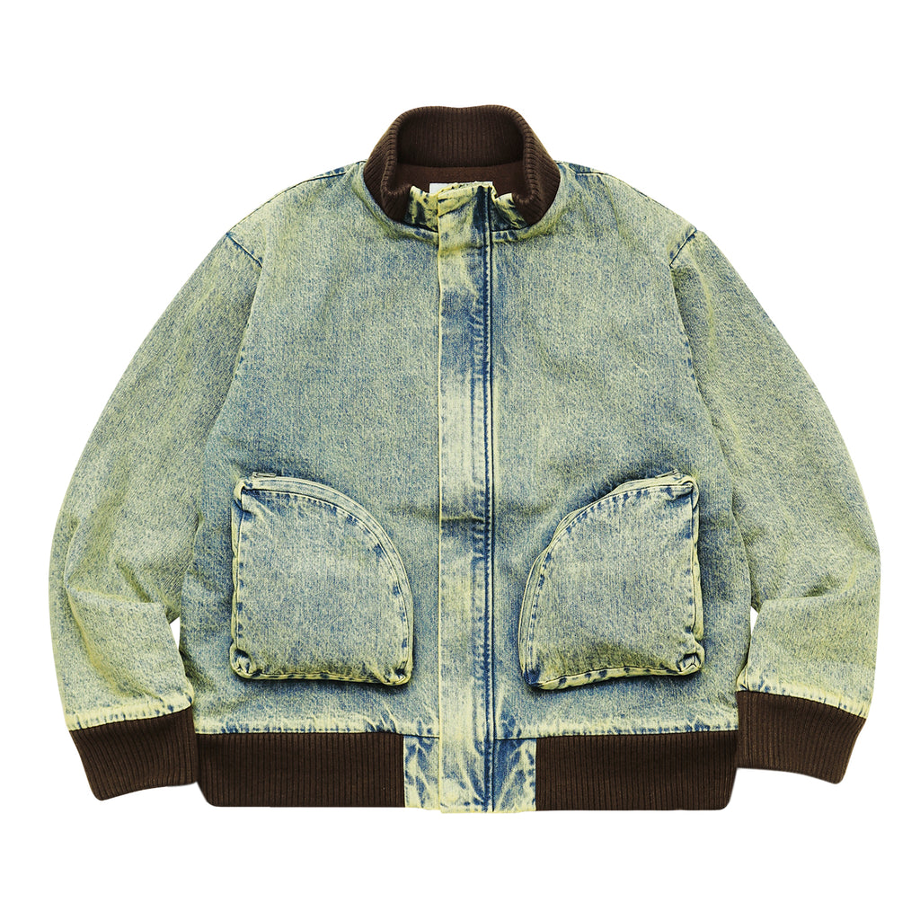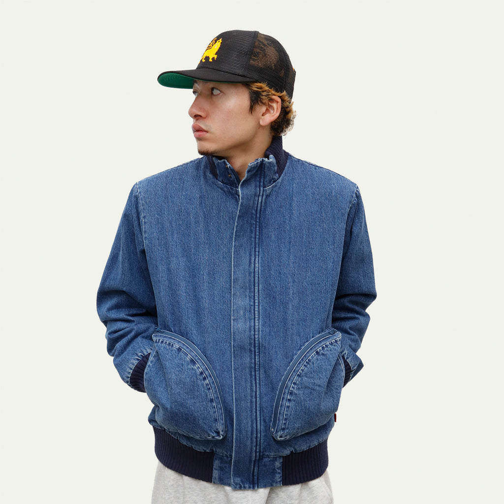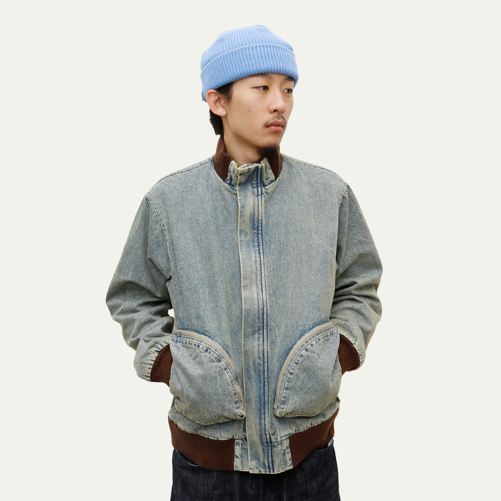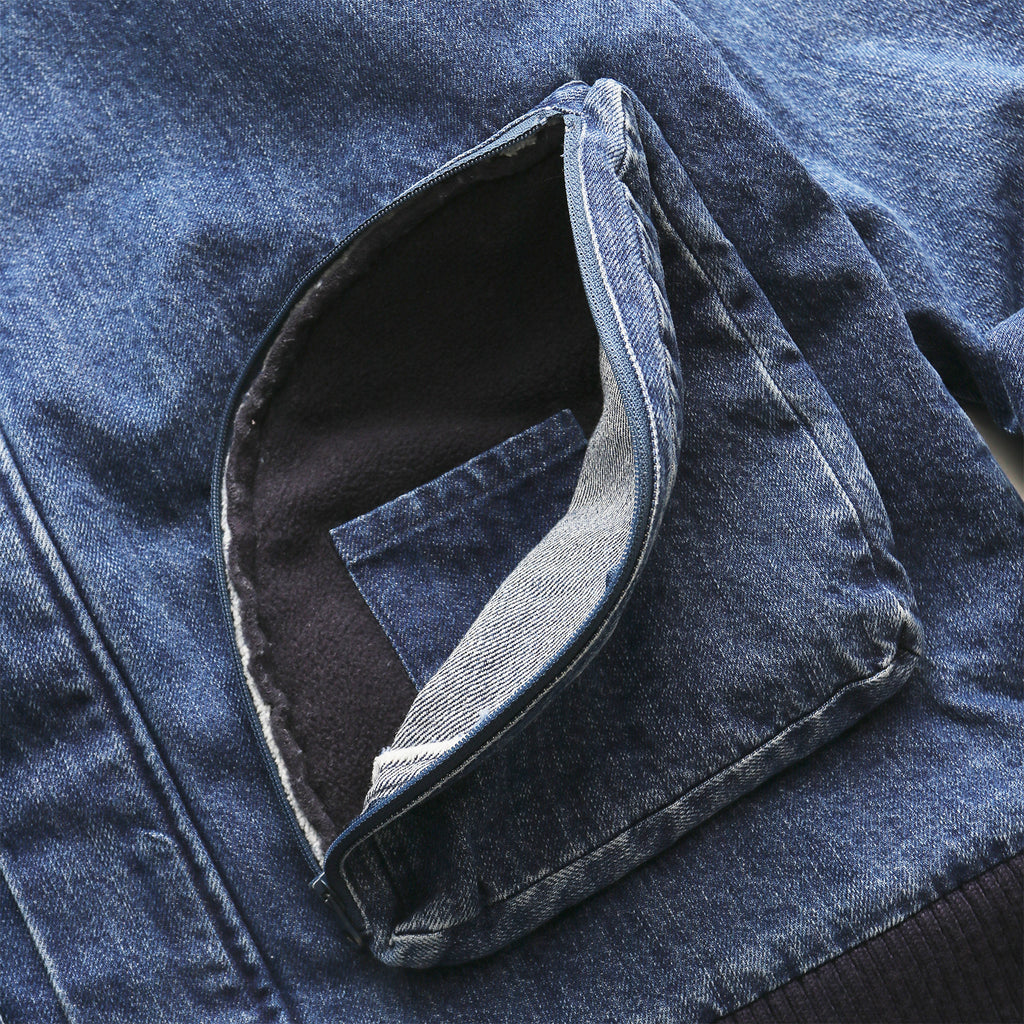 This jacket, featuring large three-dimensional pockets, was inspired by CD storage cases. Crafted from hard-washed denim with a fleece lining, it offers a relaxed fit with a shorter length, yet ample room in the body and sleeves for comfortable layering.