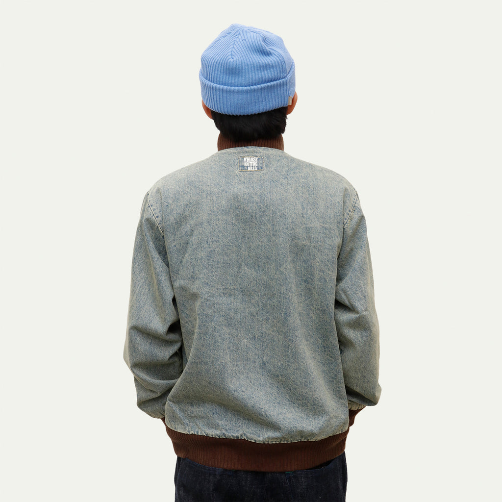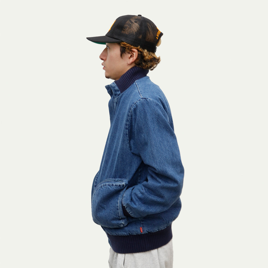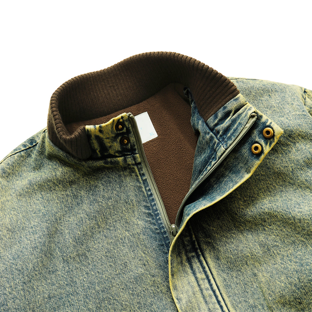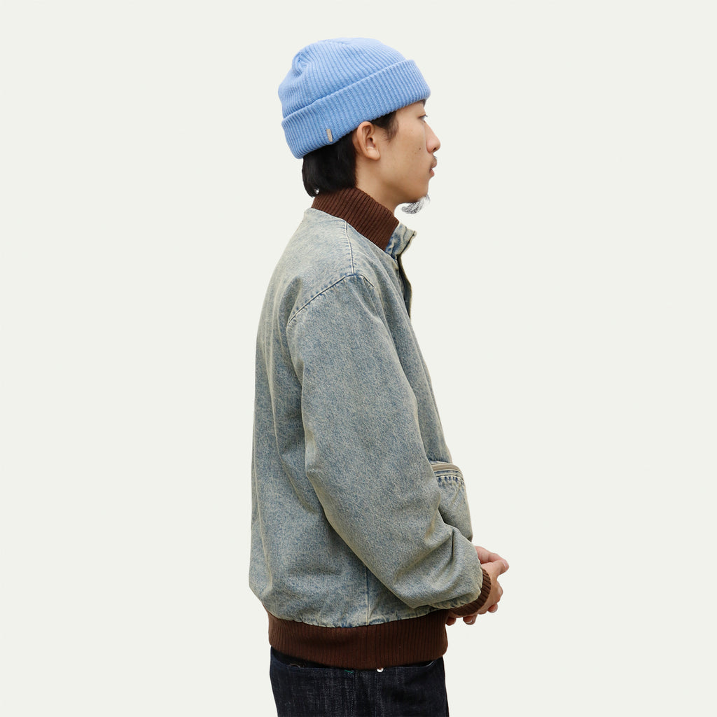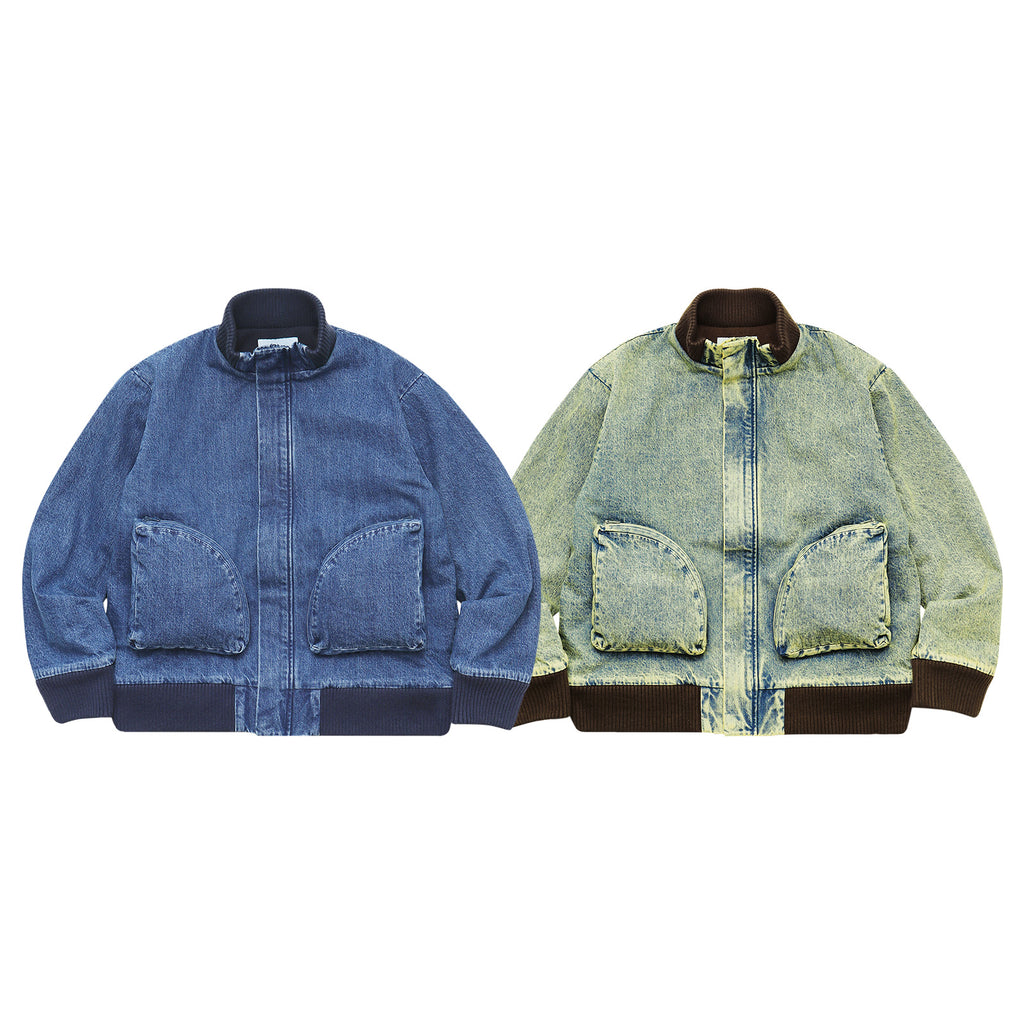 This jacket, featuring large three-dimensional pockets, was inspired by CD storage cases. Crafted from hard-washed denim with a fleece lining, it offers a relaxed fit with a shorter length, yet ample room in the body and sleeves for comfortable layering.