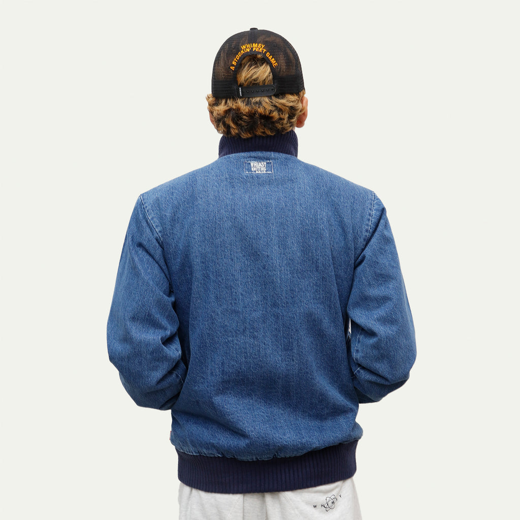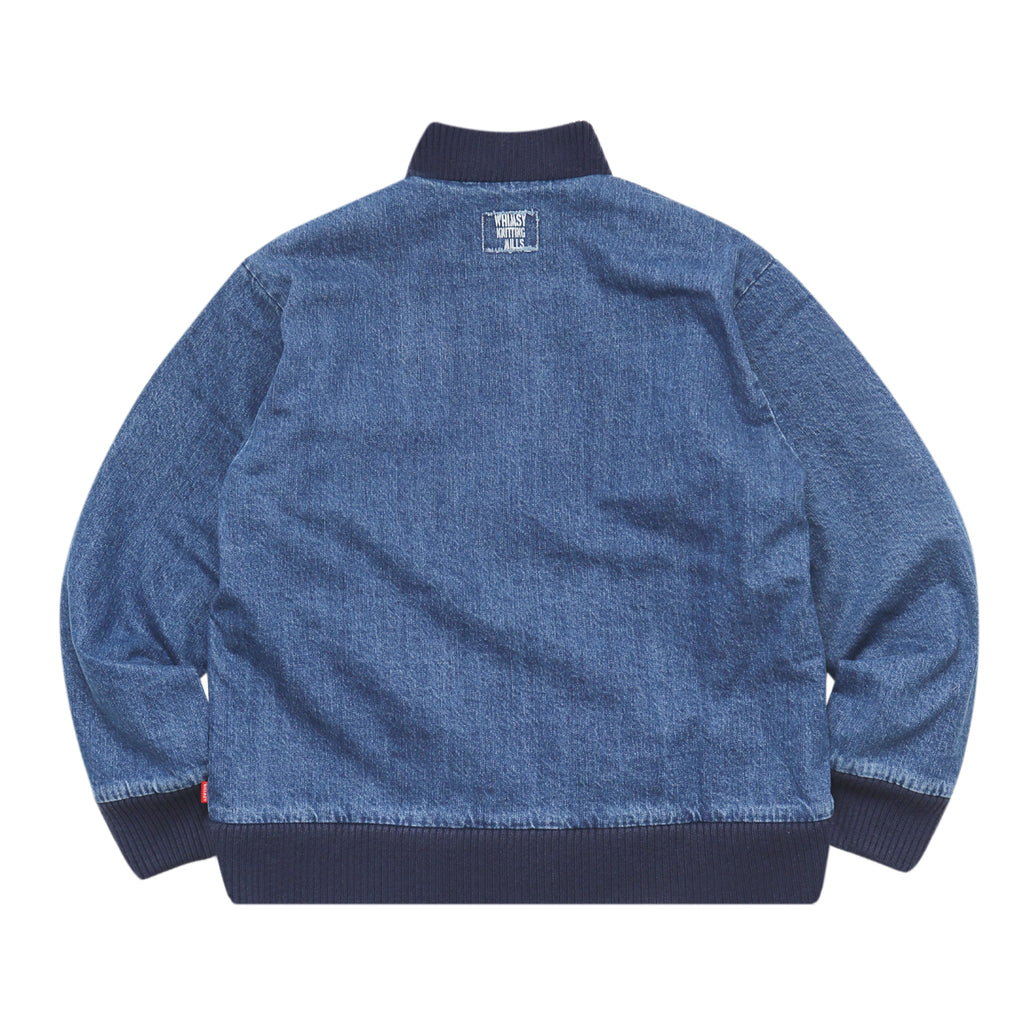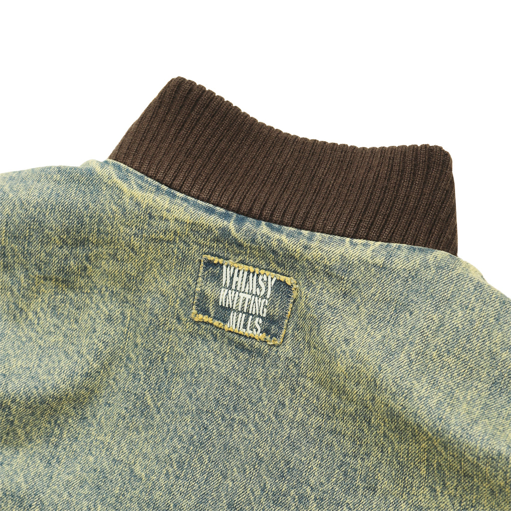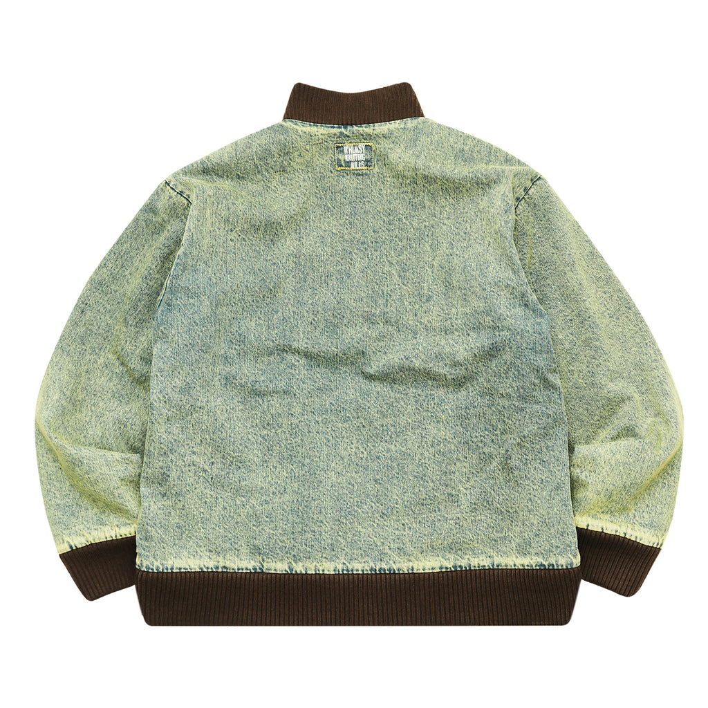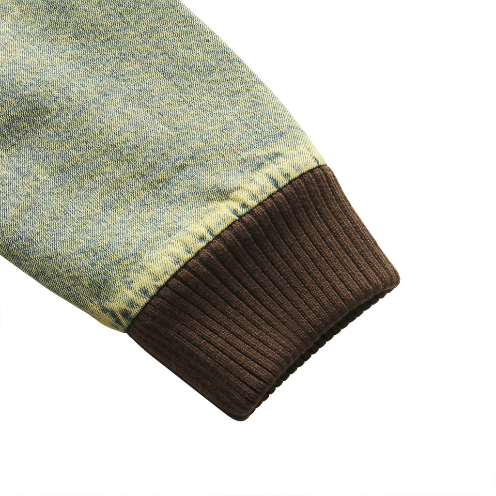 This jacket, featuring large three-dimensional pockets, was inspired by CD storage cases. Crafted from hard-washed denim with a fleece lining, it offers a relaxed fit with a shorter length, yet ample room in the body and sleeves for comfortable layering.