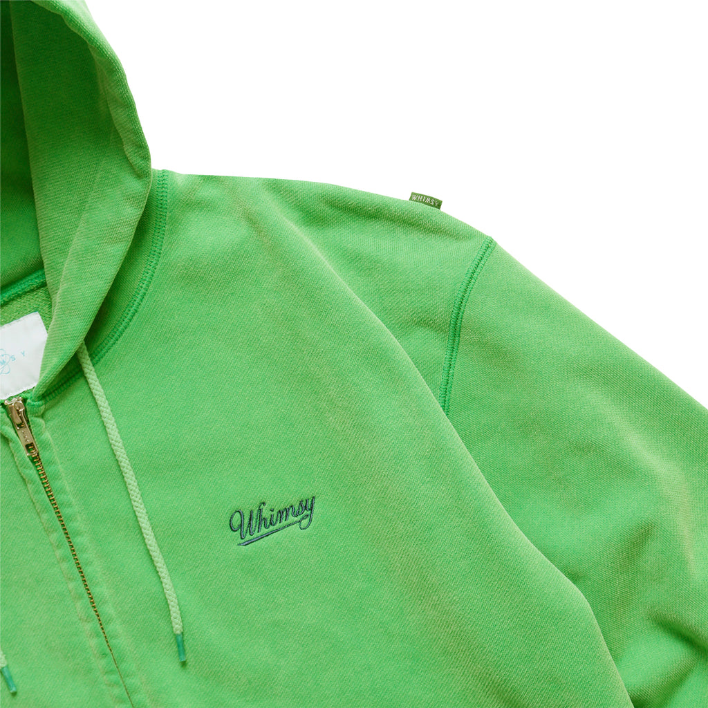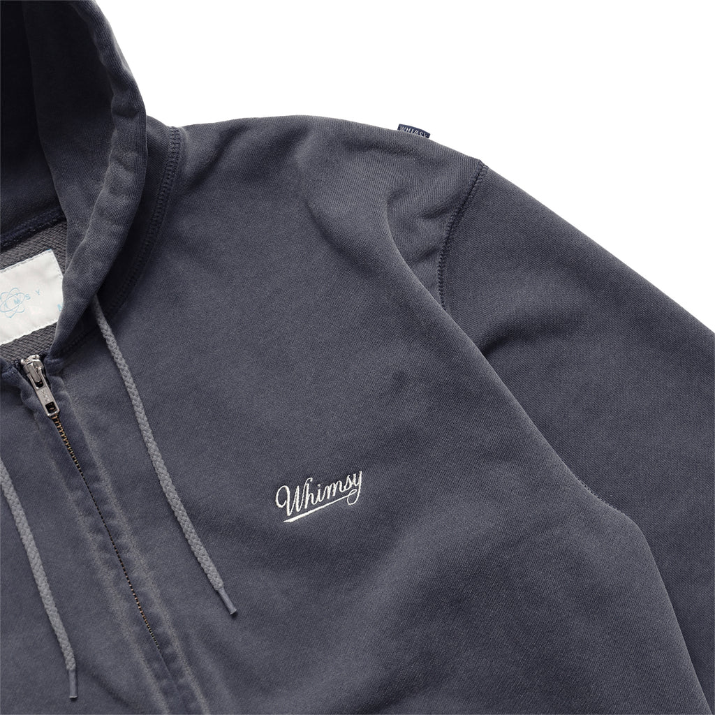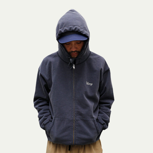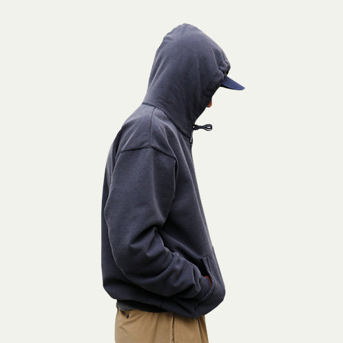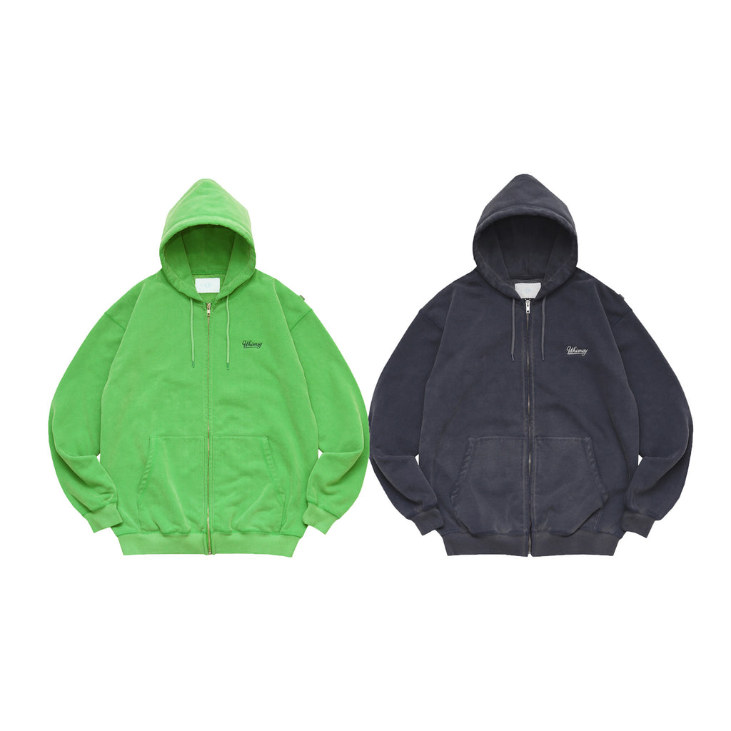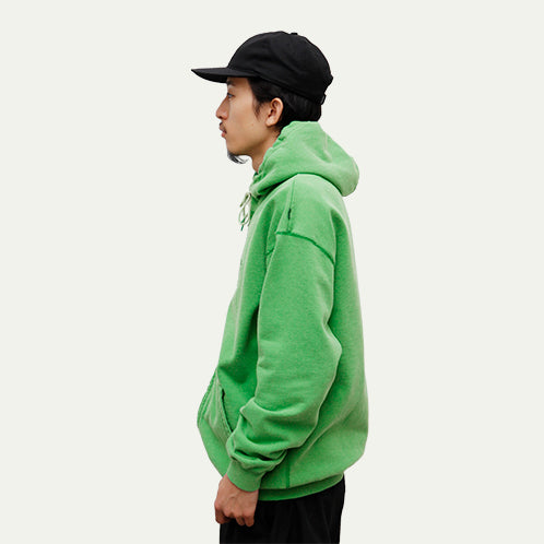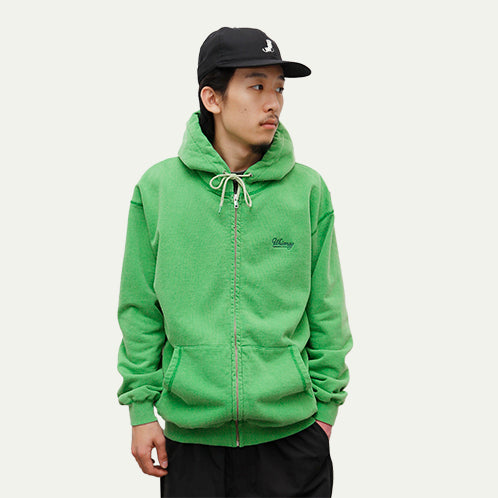 This fade-processed ZIP-UP HOODIE has an outstanding vibe. A simple piece featuring only embroidery on the left chest. Both sleeve width and body width are relaxed. A hoodie characterized by its strong ribbing.